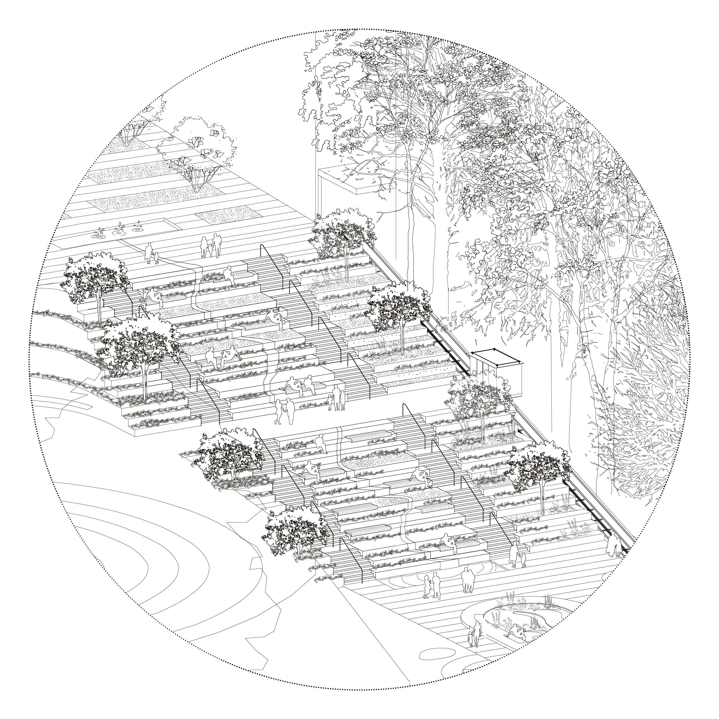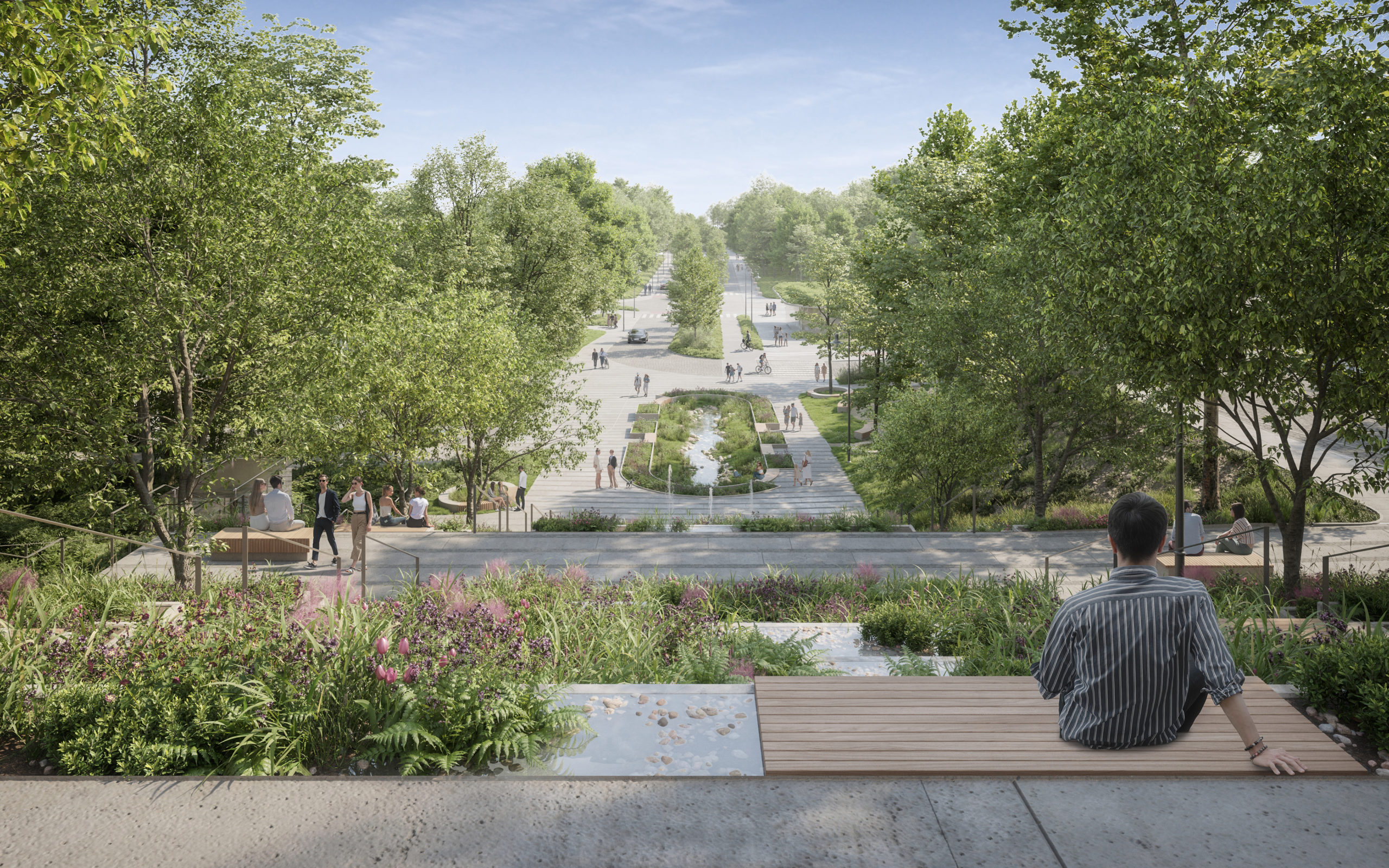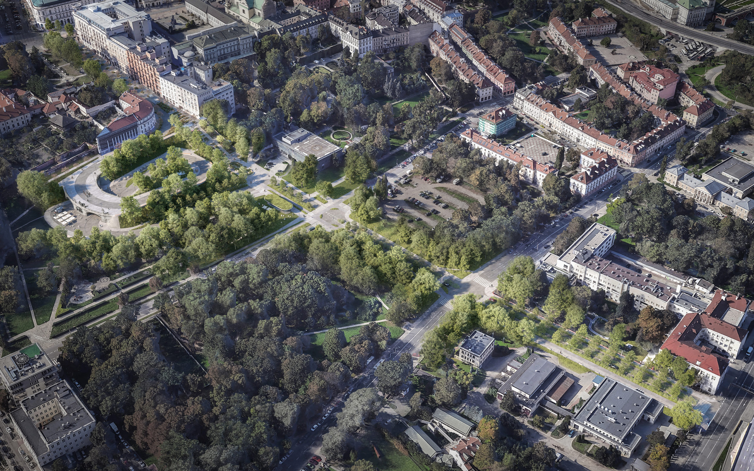 Krakowskie Przedmieście toward the Vistula, highlights the Warsaw Escarpment, and strengthens its role as a landscape element. History becomes the foundation for a contemporary, open public space.