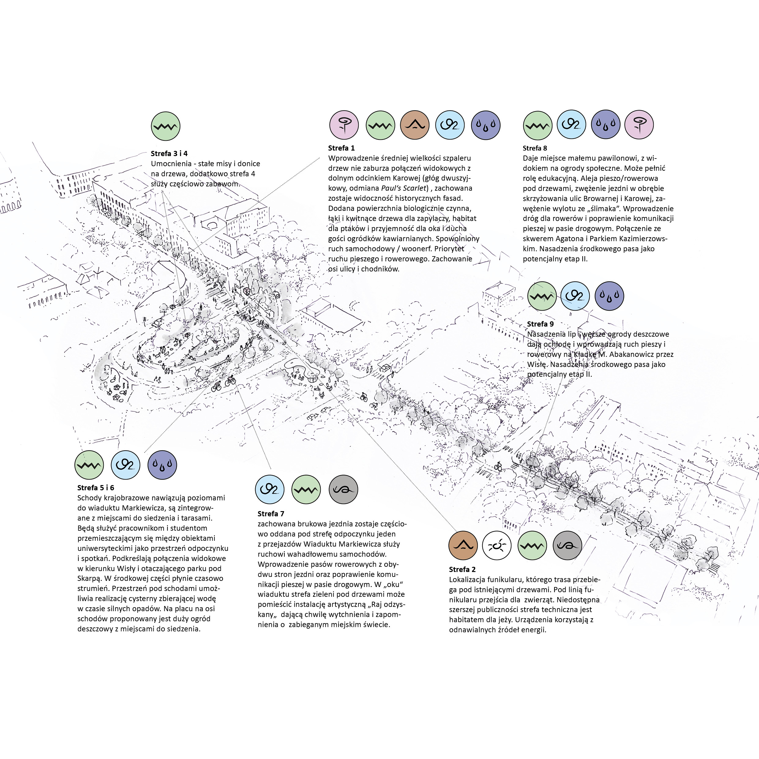 values with the potential to shape the future of Warsaw. Located within the UNESCO buffer zone and the Historic Monument area, it forms an important connection between the Royal Route, the Vistula Boulevards, and the Magdalena Abakanowicz Footbridge. The project treats Karowa as a living urban landscape – a space designed at a human scale, open to movement, encounters, and rest, where people, greenery, water, and urban fauna coexist.